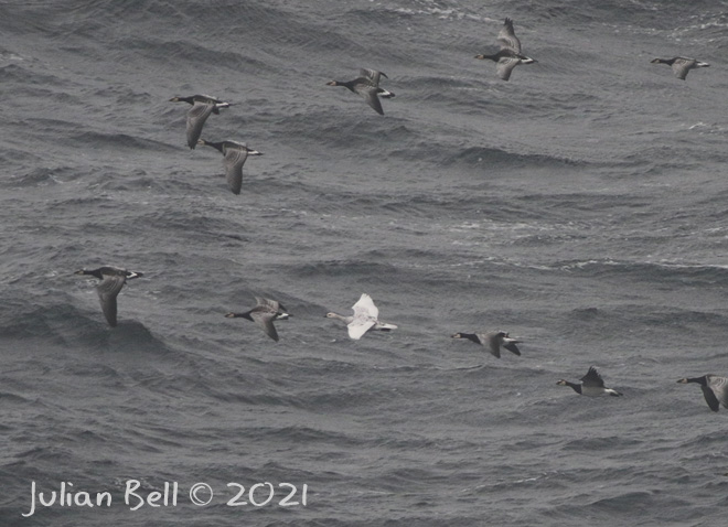 Peregrine vandrefalk and Snow/Lapland Bunting were among the other non seabird sightings of interest. Two White-tailed Eagles havørn appeared to be hunting far out to sea - at approximately 2km range - more or less where the dolphins were at one point.